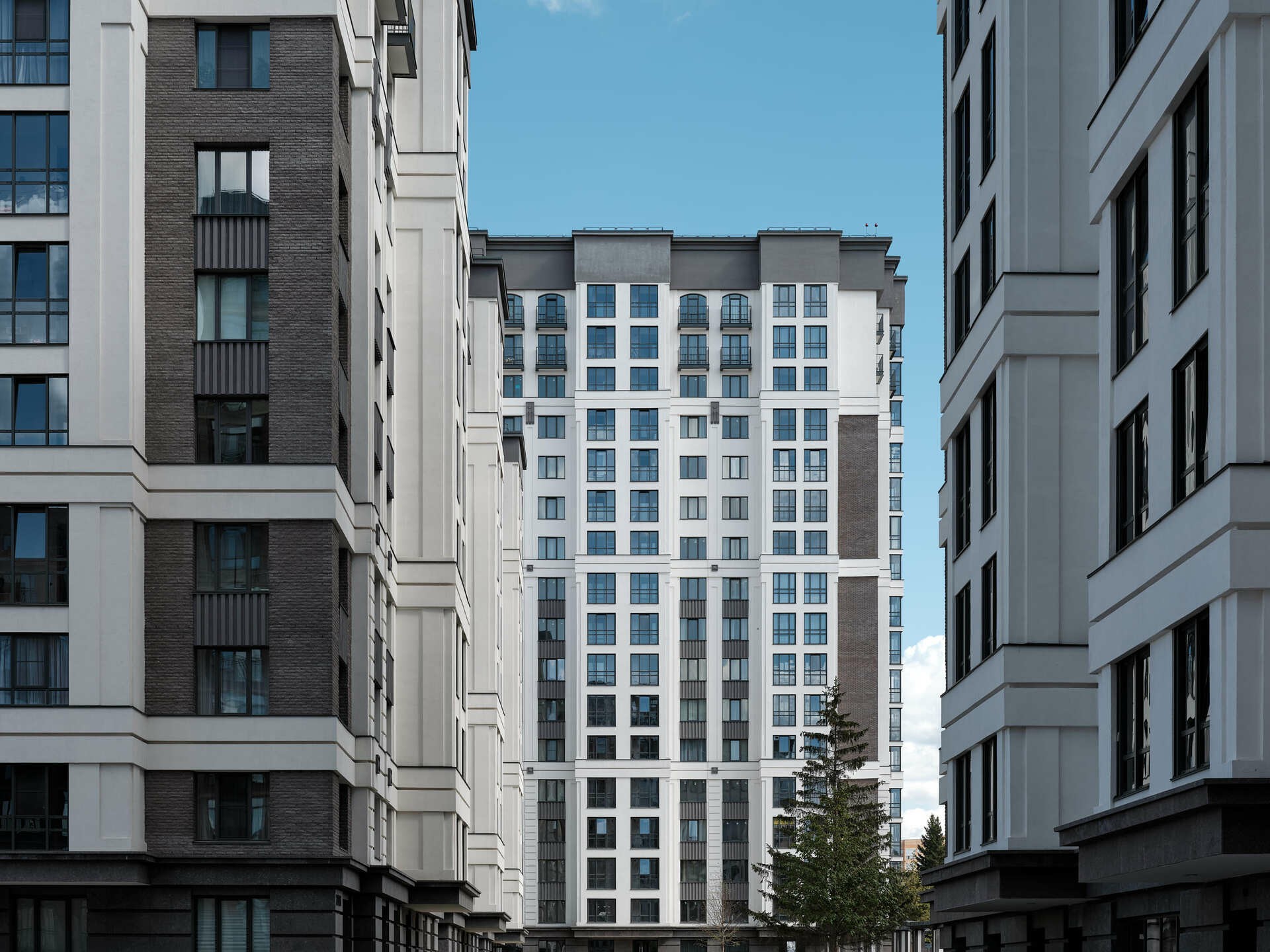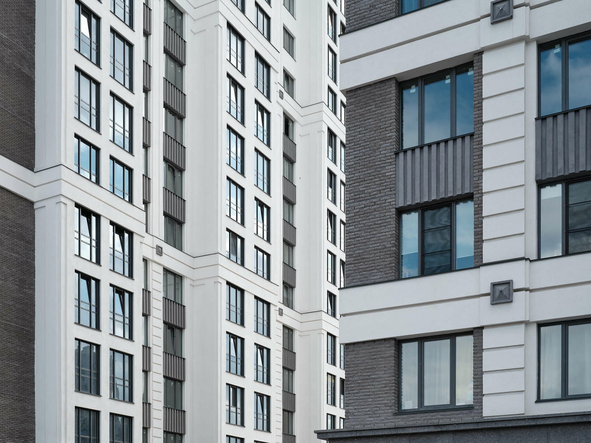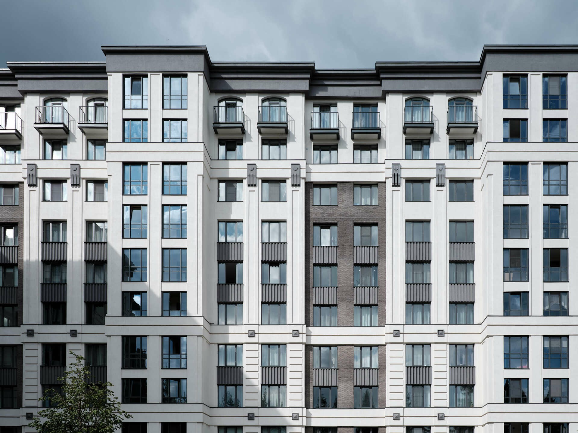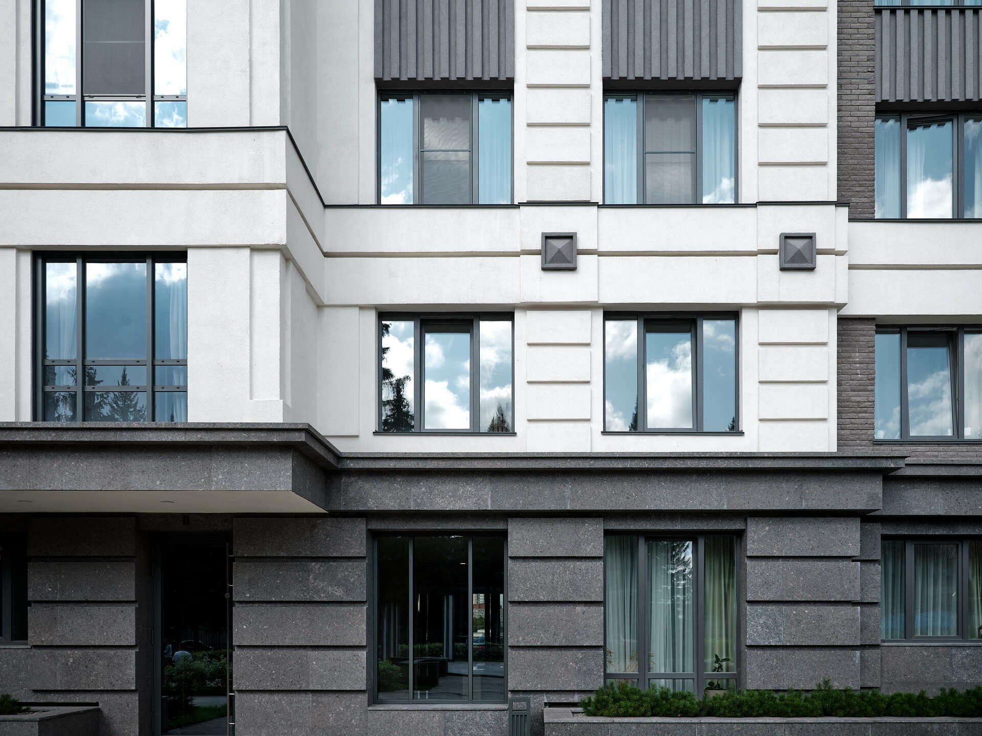 Для домов в стиле классицизма характерна строгая геометрия линий. Цветовые решения фасадов и витражное остекление лоджий создают единую, целостную картину. И ее ключевой акцент каменный фасад из натурального индийского гранита Tan Brown. В оформлении фасадов сочетаются натуральный, декоративный кирпич Brickstone и немецкая фасадная система Caparol. Плоский «графичный» фасад дома колористически сбалансирован, украшен портиками, которые визуально вытягивают здание, «разбивая» этажность. Динамичность зданию придают декоративные горизонтальные пояса и пилоны. На верхнем этаже расположены квартиры с арочными окнами, которые сочетаются с французскими балконами.
