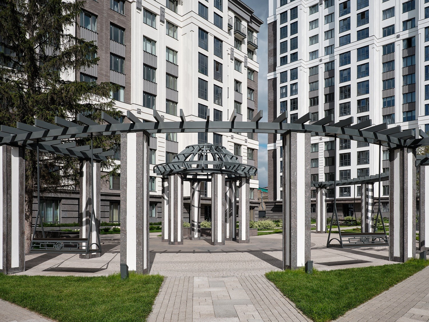 Огромная редкость для центра Новосибирска — камерная атмосфера во дворе дома. В ста метрах отсюда главный проспект города, а здесь благородная тишина, время замедляется и открывая кованую калитку вы чувствуете — я дома... Двор без машин, безбарьерная среда, круглосуточное видеонаблюдение, — все это элементы гарантированной защищенности. В центре — двор-парк, он включает в себя прогулочные аллеи, ротонду, спроектированную итальянским архитектором и колоннаду с качелями. Уникальная детская площадка, созданная специально для комплекса, дает простор для творчества и предполагает множество игровых сценариев. В жилом комплексе предусмотрено несколько видов автомобильных парковок, в том числе, подземный паркинг с доступом в здание.